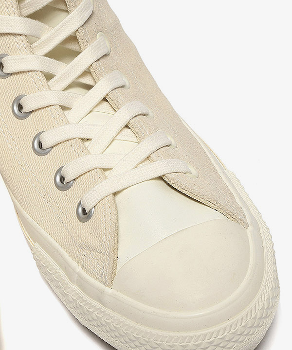 もともとアメリカのコンバースからの話は随分前からあって、最初にアイデアを提示してからのプロセスは非常に長かった。そしてその間に、今度は日本でビームスさんのためのスペシャルプロジェクトの一部として、日本市場向けのオールスターキャンバスのスペシャルが始まった。アイデアは、コンバースの定番である、オールスターのキャンバス、そしてスエードモデル、スムースレザーモデル、このバスケットシューズの3モデルをキャンバスに落とし込む事。同色で別素材というのはEGのお家芸。だけど一足に3種を入れ込むのは難しかった。単純にコンボやミスマッチで済ませたくなかったからで、ペアの両内側はキャンバスで、ハイトップはここにオールスターの丸いロゴプリントが入る。そして右足外側をスムースレザー、左足外側にスエード。キャンバスアッパーにはアルミのアイレット、レザーアッパーには同色ペイントのアイレットとそれぞれに工夫してみた。僕の中ではキャンバスのオールスターではあるけど、その中に当時のスエードのワンスターモデル、スムースレザーのワンスターモデルが部分的に共存できてる仕上げは結構気に入っている。当初から素材によって微妙な色の違いが見えるけど、これが履いていくうちにさらに違った経年変化を見せるのがおもしろいと期待している。最初の発売は、今年8月。ナチュラルキャンバスと白スムース、オフ白スエードのものが一発目。そして年明け早々にはオリーブ色が第2弾として登場する予定。これが非常に楽しみだ。もともとコンバースの軍用スニーカーのオリーブ色のものが好きだったので、今回は特に。これに合わせて、ミリタリースタイルの洋服もスペシャルで作らさせていただいた。スニーカーと同じく、同じ色目ではあるけど、数種類の異素材の混合で作ったトップとパンツで、これも非常にうまく出来上がったと思っている。興味のある人はこちらのリンクをチェックして見てください。