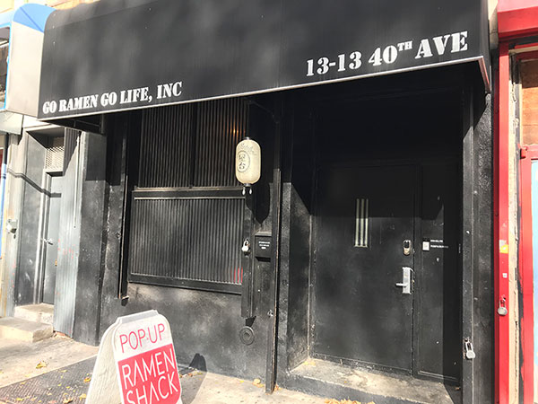 こうやって書くとカッコ良く聞こえますが、要はクイーンズ。ついにマンハッタンを諦めて都落ちしてきました。一部は最近開発が進み、街もマンハッタン並みに盛り上がってきてますが、僕らのオフィスはそこらえんとは真逆の位置にあり、まだまだ何もないエリア。それでも隣に美味しいコーヒー屋さん(Birch Coffee) があって何とか。そのついでに近所で発見したのが、壁にラーメンというロゴの黒い建物。まさに謎の建物で、皆でここが、まあまあのラーメン屋だったらどんなに便利だろうね。と話してはいたが、全く営業の気配無し。きっとラーメンの業務用の何かの建物か何かだと思いこんでいた。その矢先、健太の知り合いの飲食業界人からの緊急情報で、その店が再開されるという。しかも、その知り合いいわく、味はNY一だと。再開というからには以前営業してたんだろうけど、全くノーマークだった。俄然興味が湧いてきた。