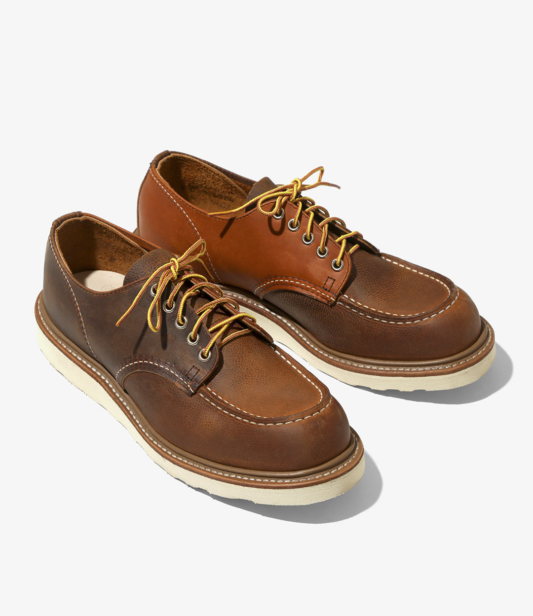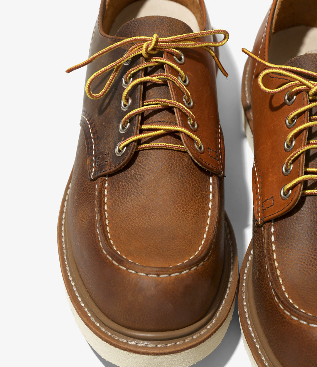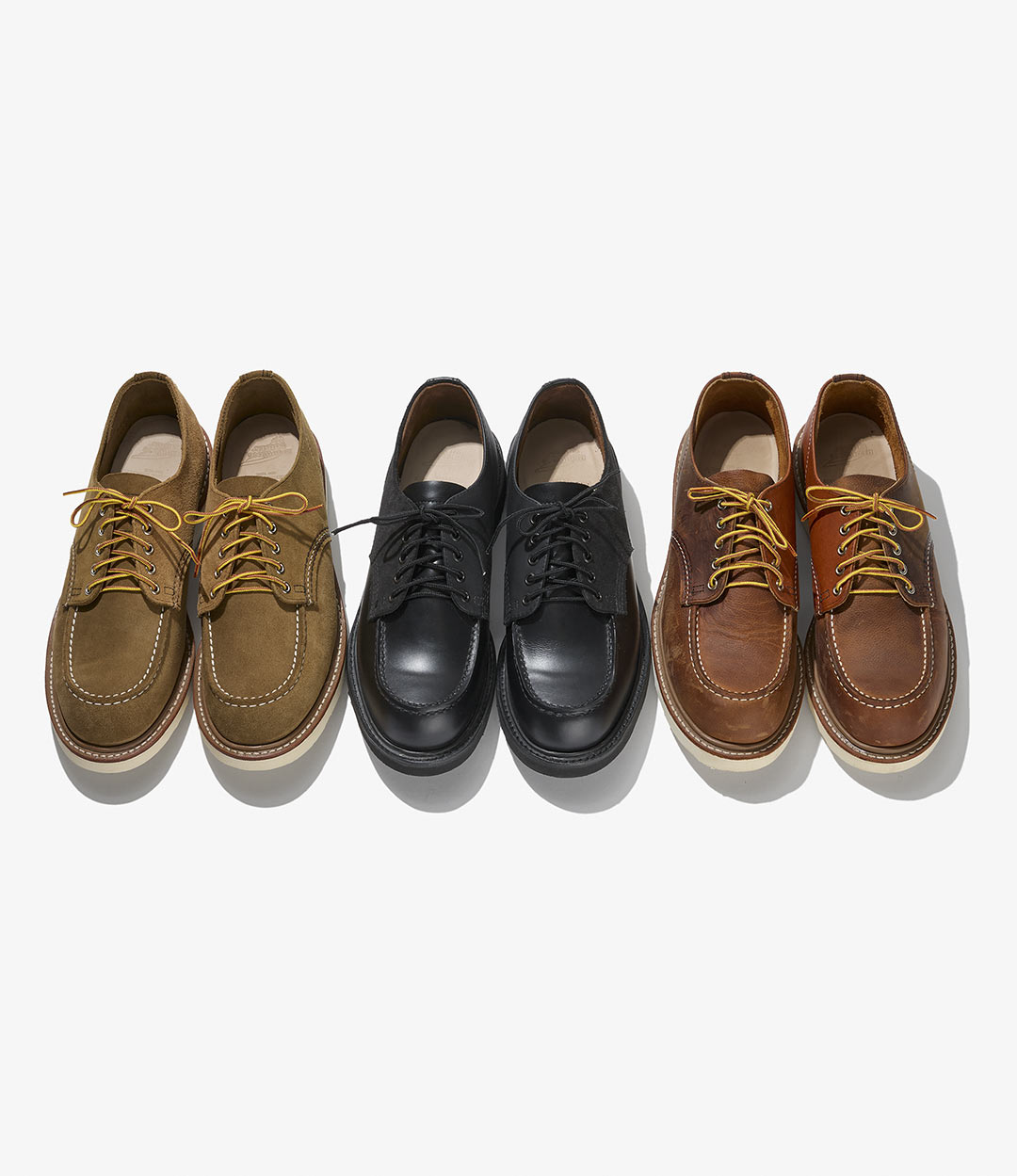 〈RED WING〉 を代表する 「IRISH SETTER」 のオックスフォード型ブーツをベースに、 表情の異なる3種類のレザーを組み合わせて採用したスペシャルモデル 「SHOP MOC OXFORD」。 昨年リリースされた既存のTRIPLE BLACKに加え、 新色としてCOPPER REMIXとCAMEL REMIXが登場しました。