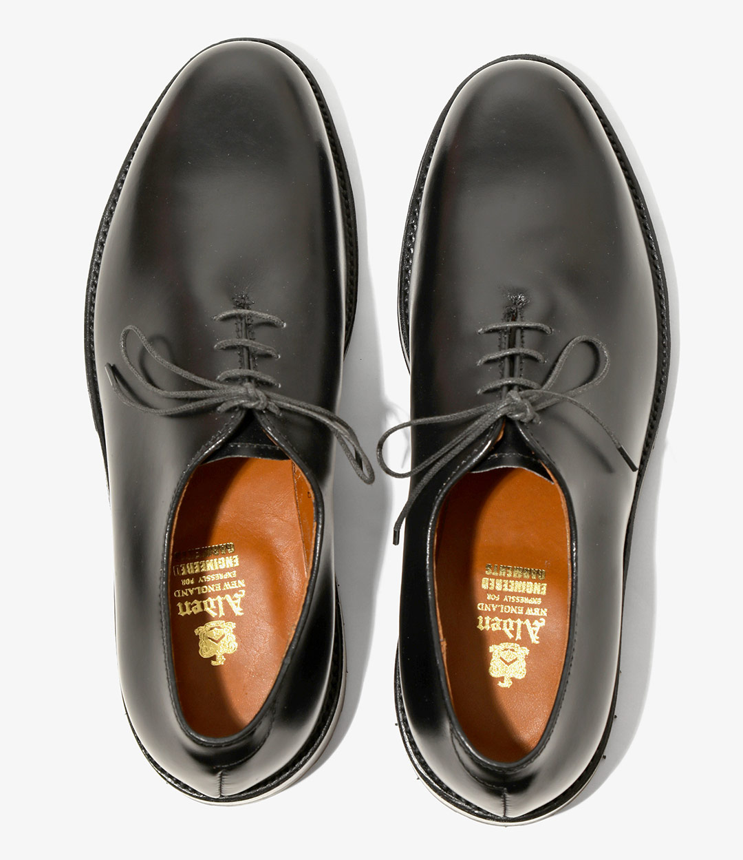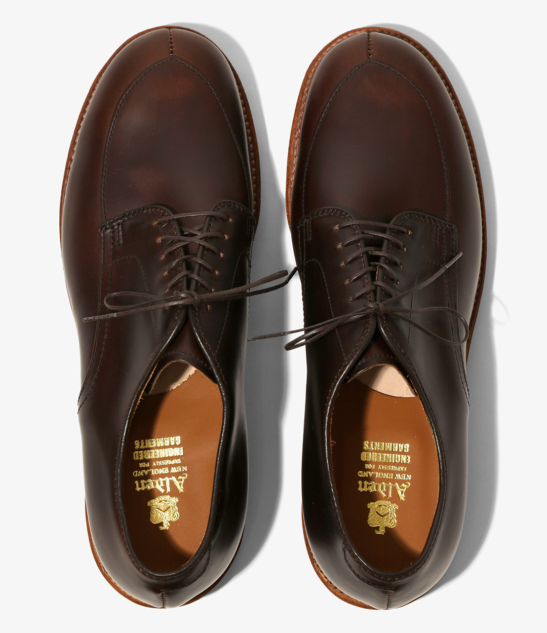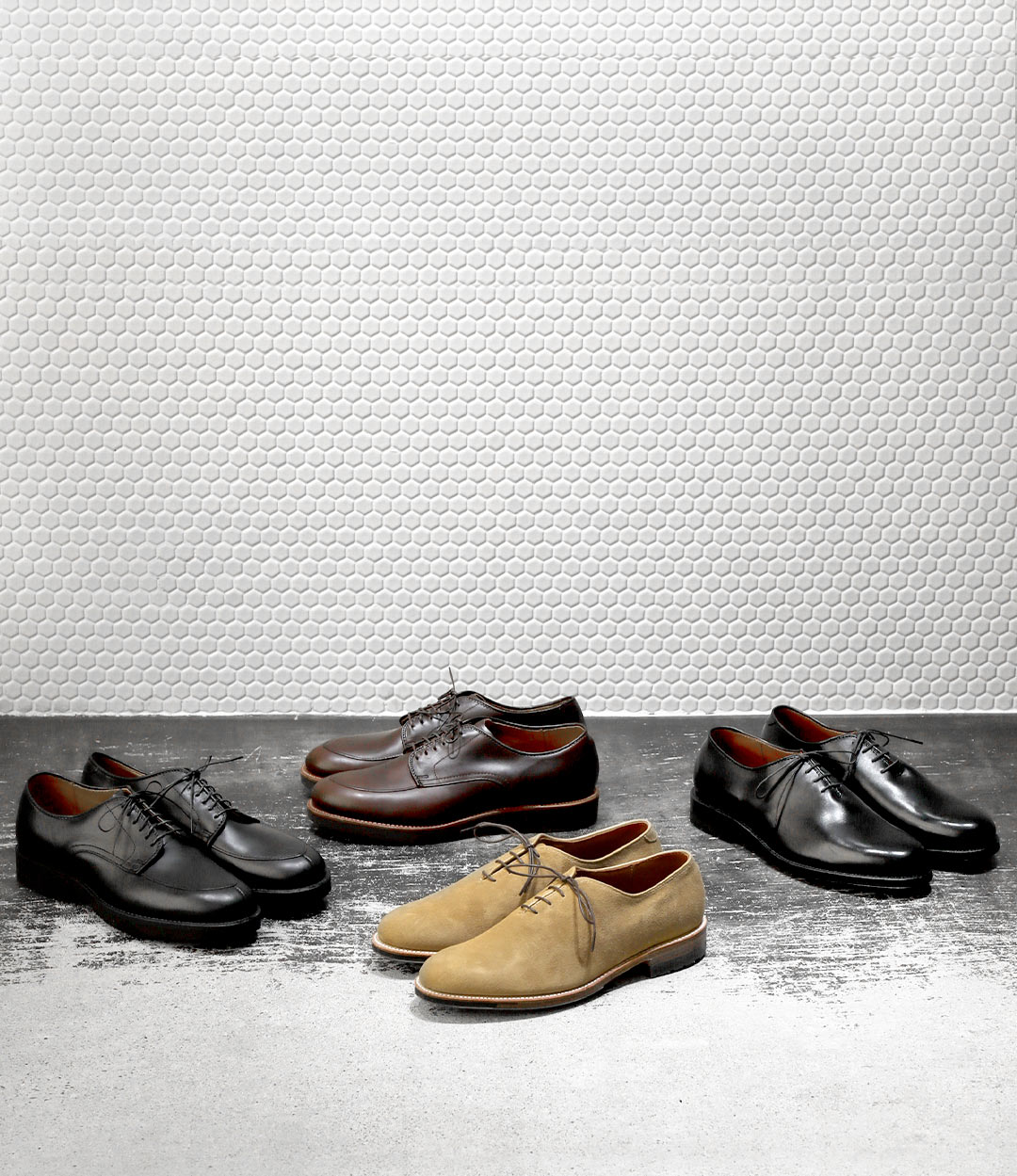 日本では定番となっている 〈ALDEN〉 の 「379X MILITARY LAST」 をベースに、 高い耐久性と安定性を誇るGOODYEAR社製 「SUPER CUSHION」、 グッドイヤーウェルト製法を採用し、 軽い履き心地で、 あらゆる天候に対応する 「ALGONQUIN V-TIP BLUCHER」。 ブラインドアイレット仕様のクローズド・レーシング構造と、 上質な一枚革を使用したホールカット製法、 アッパーの上品さと相反する 〈ALDEN〉 オリジナル 「HALF COMMANDO SOLE」 を用いることで洗練された佇まいを実現した 「WHOLECUT」 の2型がラインナップ。