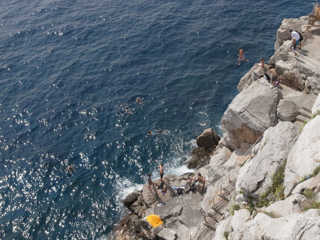 スプリットとドゥブロブニックの旧市街はユネスコ、世界遺産に加盟されているだけあって、素晴らしい町並みでした。とくにドゥブロブニックの旧市街はほんとうに奇麗だった。暑い日差しの中を旧市街の城壁を歩いた。汗だくになったけど、城壁からみる旧市街は今までに見た事のないタイプの街並で感動しました。城壁の真下にはビーチがあり、若者達が高い岩から真っ青のアドリア海に飛び込みをしているシーンも夏らしい。どこのビーチも水は透明で真っ青、奇麗という言葉しか出てこなくて何回この言葉を口にしたことか。ちなみにクロアチアのビーチは大半が砂ではなく、砂利のビーチで、ゴツゴツした岩だらけのビーチもたくさんありました。残念ながら今回の旅行では海に行く機会はなかったから、海岸でのんびりと寛ぐ人達を遠目に私はひたすら観光地をまわりました。もう少しながく休みが取れたら、ビーチでもゆっくりできたのですが、まあ遠目にみているだけでも十分だった。
