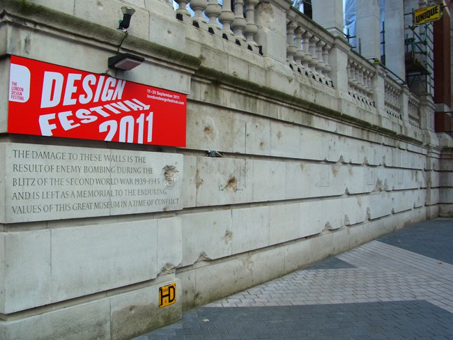デザインフェスティバルとはちょっと離れるのですが、このヴィクトリア&アルバートミュージアムでちょっとした発見がありました。まず美術館の歴史は1851年までさかのぼります。ロケーションは何回かかわり、最終的に今の場所になったのは1857年です。その頃はまだ、サウスケンジントンミュージアムだったのですが、1899年より今のヴィクトリア&アルバートミュージアムになりました。建物は外見も内装も素晴らしいもので、何回観ても飽きることなく奇麗だなと思える建築です。今回の新しい発見は、建物向かって左側、エキシビションロードに面している壁なのですが、壁の至る所が陥没しているのです。この壁以外、建物はとっても奇麗なので、どうしてこの壁だけがこんなにもぼこぼこしているのだろうと思ったら、なんとそれは第二次世界大戦時の空襲によって受けたダメージをそのまま残していたのでした。何度も歩いている道なのに、今まで全く気が付きませんでした。