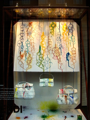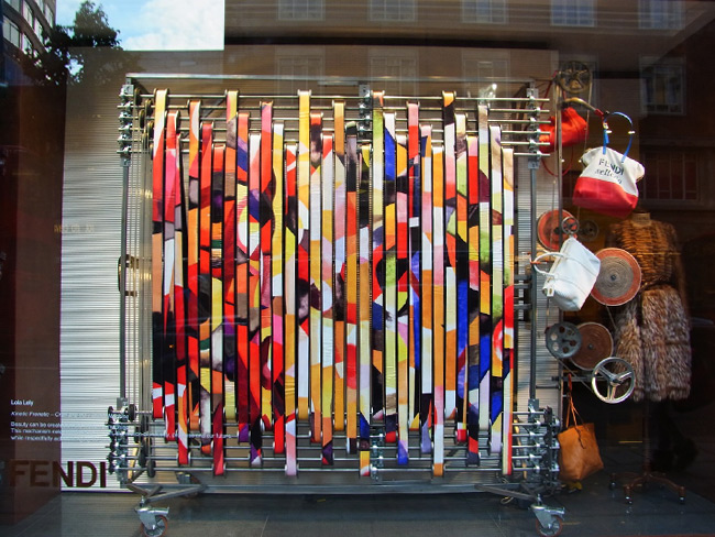 さて、デザインフェスティバルに話しを戻します。続いて注目した作品は、スローンストリートにオープンした新しいFENDIのショップです。そのグランドオープンとデザインフェスティバルを記念したもので、ショップ自体のデザインはPeter Marinoによるものなんですが、ウィンドウディスプレイとショップディスプレイをなんとロイヤルカレッジオブアートのプロダクトデザイン科の学生に任せようという企画です。