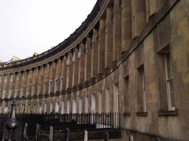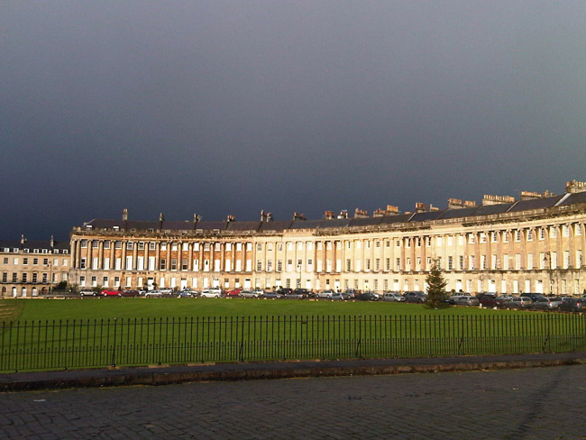 この素晴らしい建物ロイヤルクレゼントはジョージアン時代に建てられたものの中でも代表するイギリスの歴史的建築物のリストにも入っている建物。1767から1774年にかけて建築家のジョン&bullヤング親子によって建てられた建物です。お天気はもちろん雨が降ったり、日が射したりと天候が5分ごとに変わるようなお天気で、真っ黒な重たい雲がクレゼントを後ろから覆うようなドラマティックな景色は、まるで映画のセットのようなイギリス独特の景色でした。今まで行ったイギリスの都市のなかで、バースが一番奇麗な街だと思ったほど、ここは観光する価値のある街です。