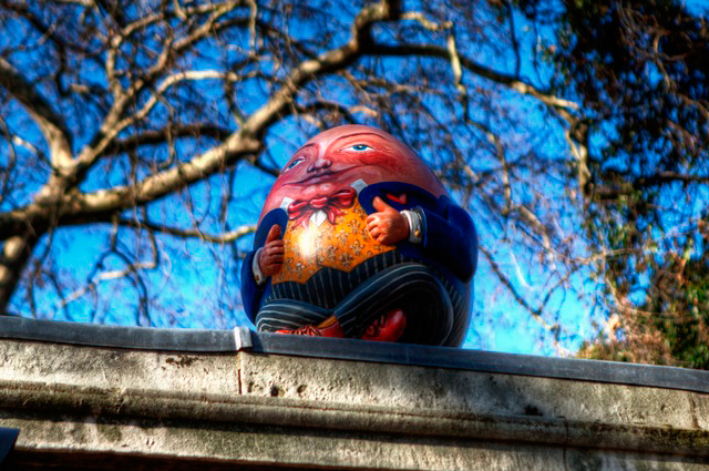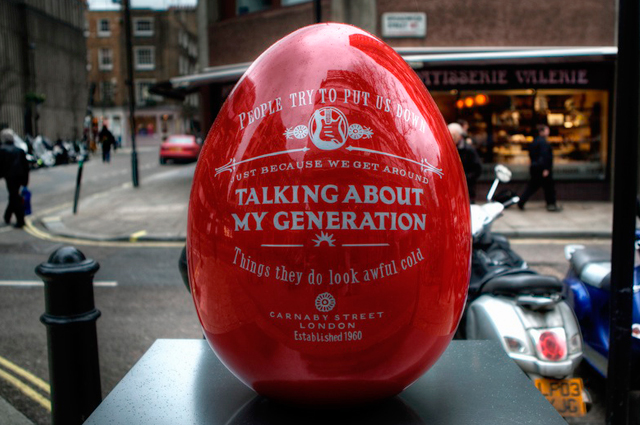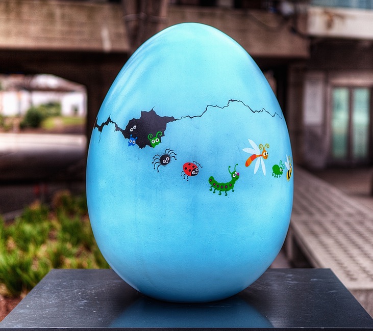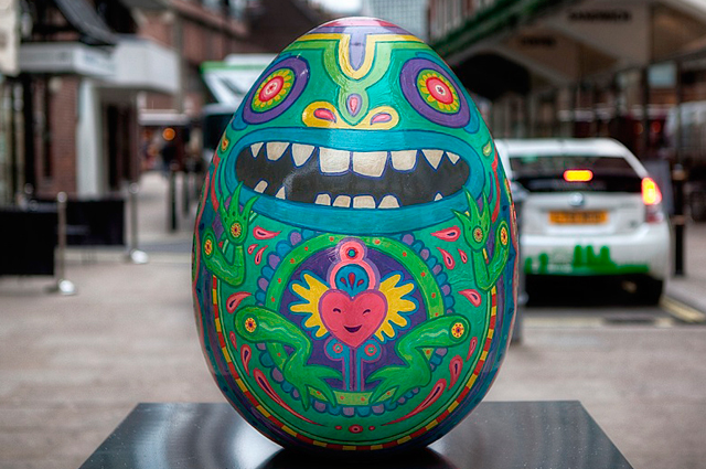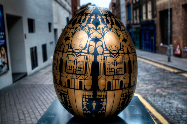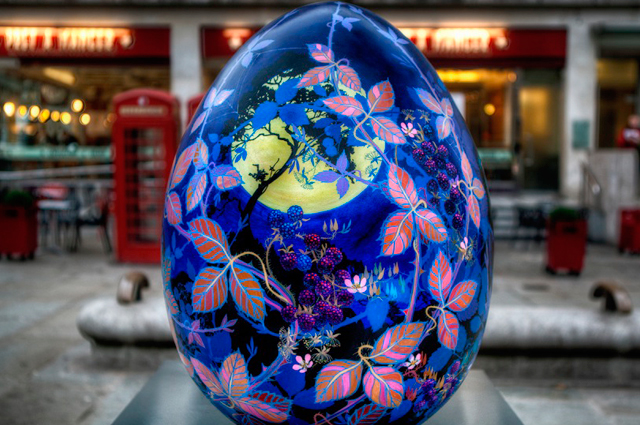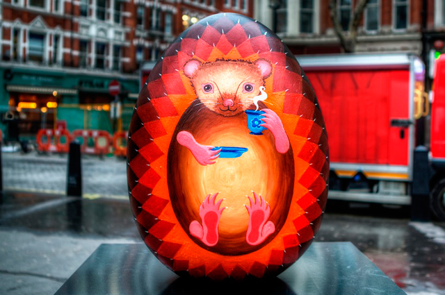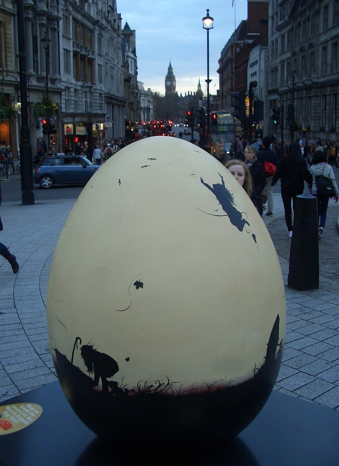 その通常のエッグハントの規模を大きくして、200個以上もの大きな卵がロンドンの至るところに置かれていて(隠されていて)、それを見つけてそれぞれの卵に書かれている秘密の暗号をSMSメッセージで送ることにより、なんと抽選でたった一人にゴールデンエッグが当たる!というのがこのイベント。