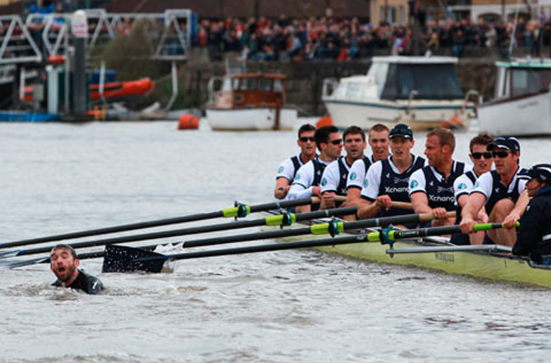今年はレース中に、いくつかのアクシデントがありました。まず、レースがスタートして10分程たった頃、両方のチームに殆ど差はなく良い張り合いをしていたところに、突然オックスフォードのボートが止まり、ケンブリッジのボートも止まった。すると、一人の男が水中からひょっこり顔をだして泳いでいる。中継をしているレポーターもビックリ。でもなぜこの男はボートレース中に泳いでいるのか?