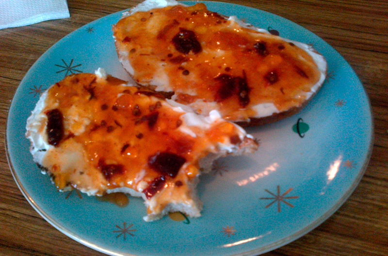 さて肝心のメニューをじっくりみてみると、結構、微妙なコンビネーションの食べ物ばかりで、どれもピンとこない。美味しくなかったら気まずいし。そんな心配をしながら、ずーっと考えていると、友達が写真のものを薦めてくれた。こうなったら、美味しくなくても美味しいと言わなければと覚悟してそれをオーダーし、ドキドキしながら待っていました。私の前にその食べ物が置かれ、恐る恐るかじってみる。すごくおいしい!友達がお薦めしてくれたのは、パンの上にクリームチーズ、アプリコットジャムとメキシコのChipotleがのっているだけのシンプルなディッシュでした。今、このChipotleを日本語でなんていうのかを調べる為にウィキペディアを見てみた。ちなみに日本語ではチポレ、そして下の方に、日本人はチポレの風味を鰹節のようだと表現する人が多い、と書いてあった。そう、私がこのパンを一口かじった時に、頭に思い浮かんだ味はお好み焼きでした笑。