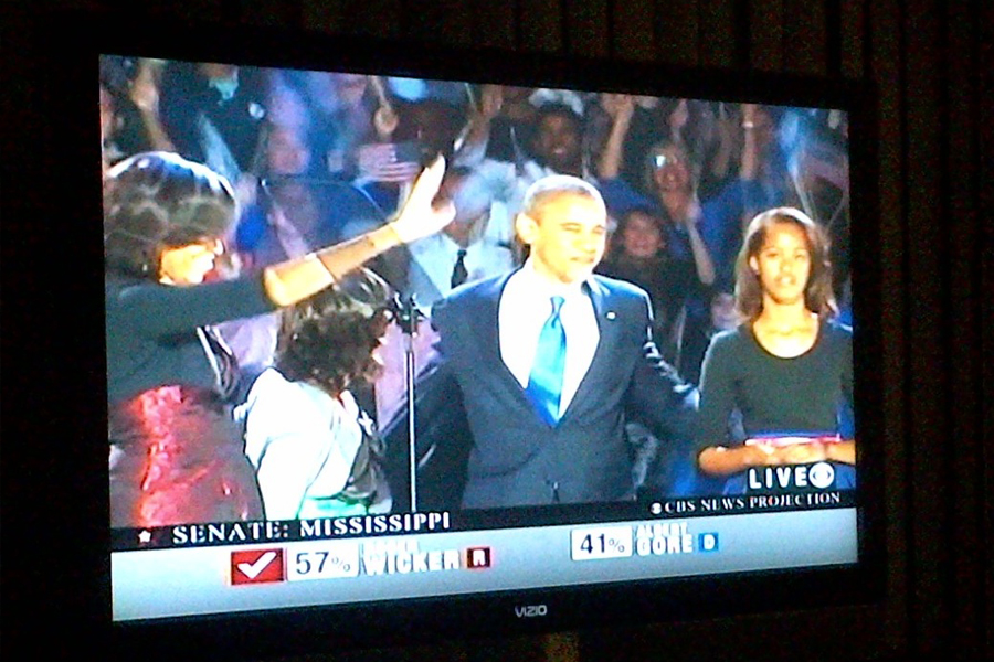 私のなかではワールドカップ決勝戦を見に行くような感覚で、もちろん選挙の仕組みを完璧に理解しないまま、ずっとテレビをみてみました。丁度、ハンバーガーを食べ終わった頃に、いきなり回りから盛大な拍手が沸き上がった。キョロキョロしながら、大統領が決まったのかな?! そうすると、「おめでとうオバマ」ってどこかから聞こえてきたので、私たちも改めて乾杯をしました。