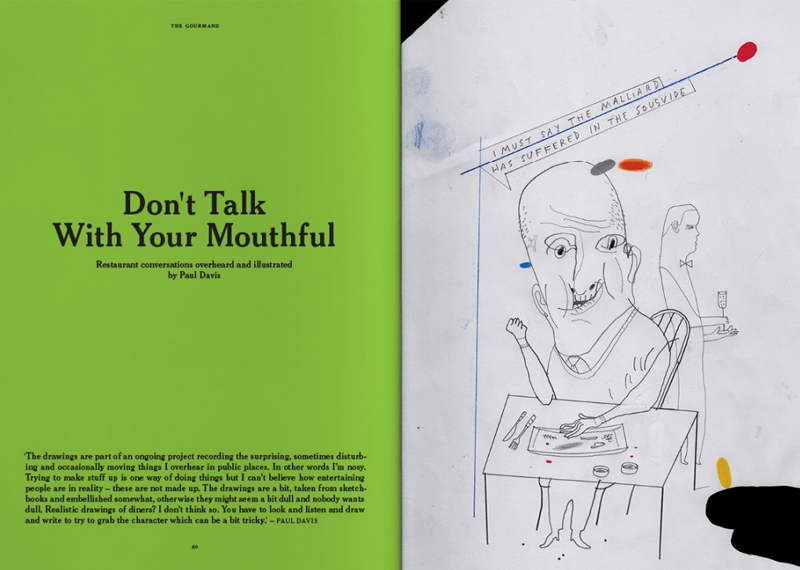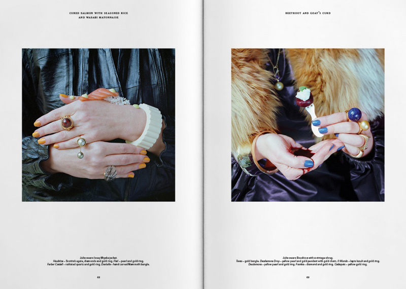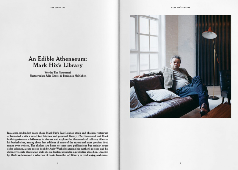 この初刊にはロンドンの有名レストランのシェフ、過去4年間で7つものレストランをオープンさせた、Mark Hixの記事が掲載されていました。彼の一番新しいレストランは、イーストロンドンに昨年オープンした「Tramshed」。ローストチキンとステーキのみがメニューのレストランで、お皿にのって出てくるローストチキンの姿がとっても滑稽で有名。記事はこの彼の家の本棚にあるたくさんの本の中から、食べ物に関しての本を紹介したもので、Damien Hirstのホルマリン漬けの牛と鶏も見所。