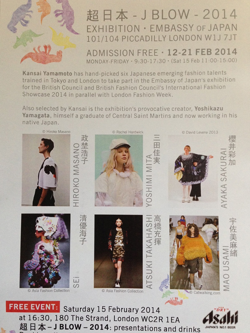 写真を撮りたかったのですが、大使館内の撮影は全面禁止だったので、残念ながら写真はなしですが、彼らの作品は今日から日本大使館でロンドンファッションウィーク期間中はずっと展示されますので、ロンドンにいる方は是非見に行ってください。そしてこれを機会にこの6人の若者デザイナー達が世界で活躍する有名デザイナーになることを願っております。がんばってください!