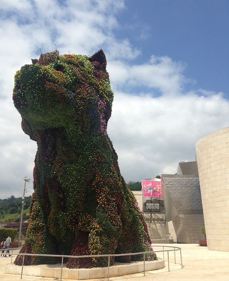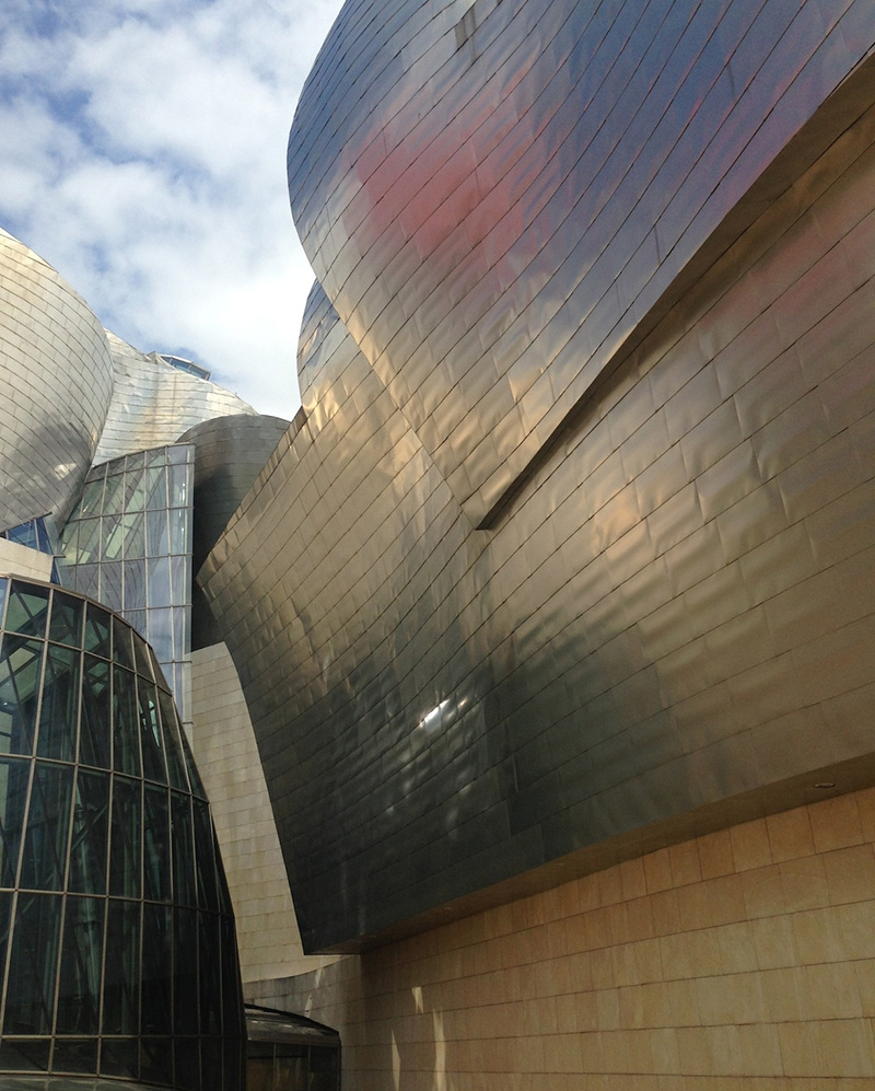 まずは、グッゲンハイム美術館。空港からビルバオの街に向かっていくとグッゲンハイム美術館がウェフカムしてくれます。堂々と構えるこの建物ですが、周りのランドスケープとの調和が素晴らしく、中も外も素敵。