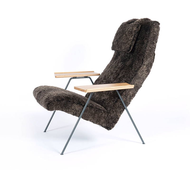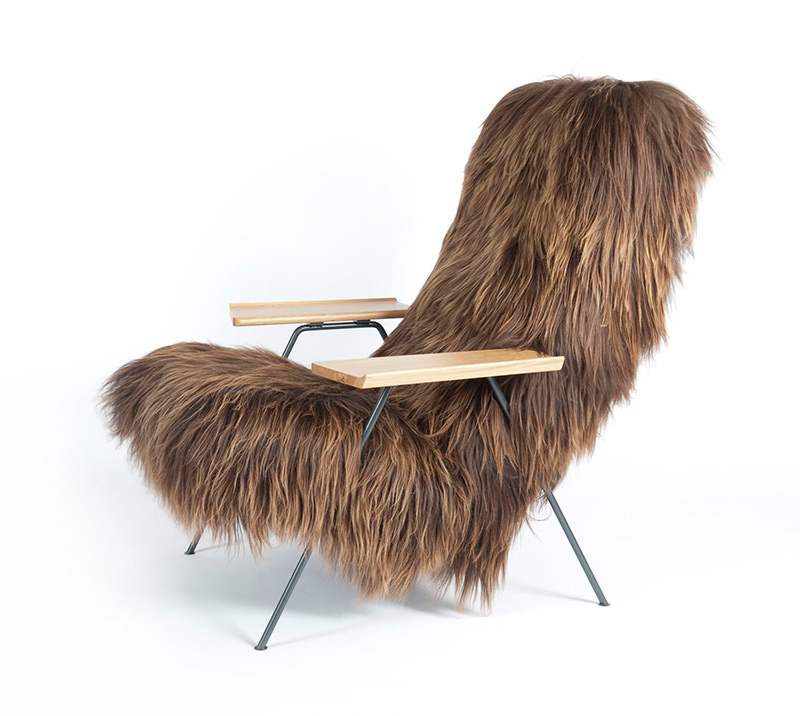 イルサが選んだ素材はアイスランド製の毛のなが~いシープスキン。とてもソフトな感触が座ったときに快適さを与え、乱れたワイルドな毛のラインがロビンの直線的な椅子の外観を柔らかくします。生前のロビンはロッククライミングやノルディックスキーなどを趣味とし、大自然が大好きだったということから、この生地を使う事によって彼のパーソナリティーがうまく椅子に反映されました。