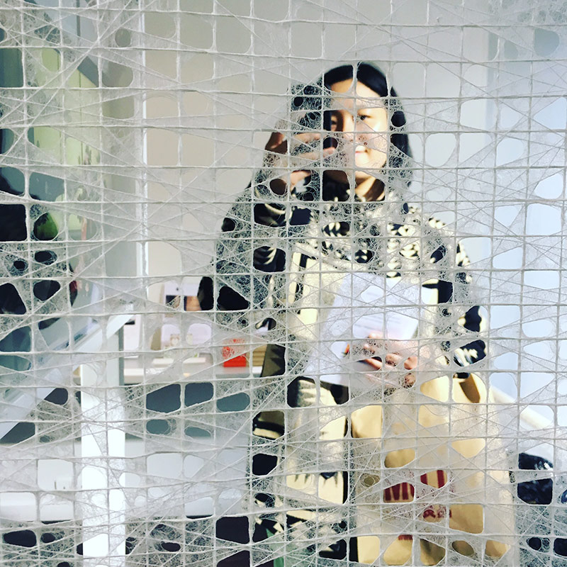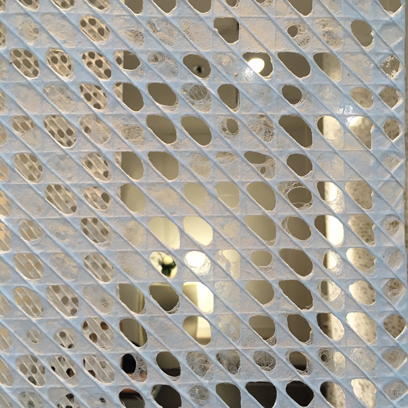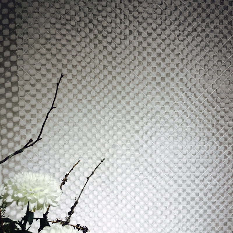 和紙の産地である彼女の地元、愛媛県内子町の五十崎(いかざき)和紙を現代風にデザインし生産されているそうです。オーダーメイドでそれぞれの物件、空間にあった作品を一枚ずつ手作り。彼女の和紙は織物の縦糸と横糸のように何本もの糸が張っていて、そこに和紙をのせてから、穴を一つ一つ指で開けるそうです。すごく大変な作業です。この不均一な穴から抜ける光がこの日はお天気も良かったのでとっても綺麗でした。和紙から抜ける光ってとっても柔らかく、部屋全体が暖かくなります。日本の家屋にはもちろんだけど、蛍光灯がないヨーロッパのお家にもしっくり当てはまりそう。間接照明だけのリビングルームに一枚とかいいな。