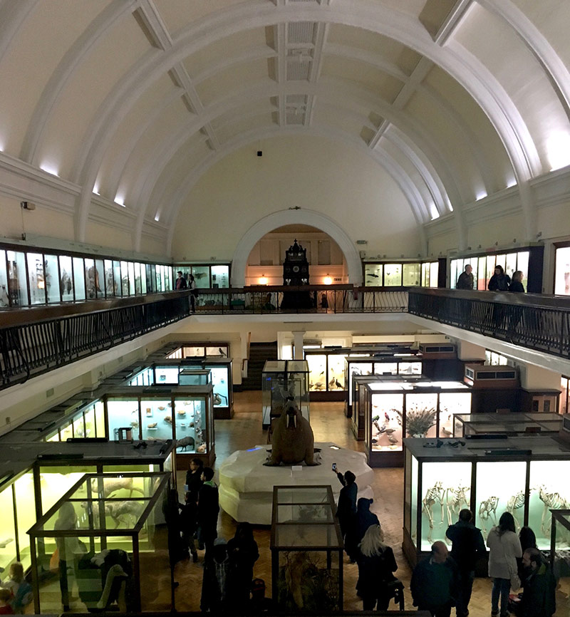 まず昆虫採集に興味を持ったのですが、その趣味が鳥類、哺乳類、爬虫類、恐竜の化石などの採集に拡大して大きいものではこの博物舘の顔、みんなを歓迎してくれるセイウチくん。これらのコレクションなんと全部で25万個だそうです。建物も展示用キャビネットも昔のままでとっても素敵な空間です。