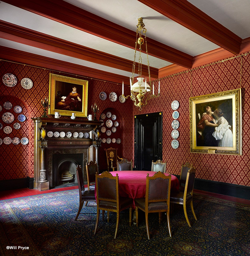 そしてたくさんのお皿がディスプレイしているダイニングルーム。Flock Wallpaperといって、19世紀に流行ったベルベットに見せかけた壁紙。ウールの細かい粉を壁紙に吹き付けて、凹凸のあるテクスチャーにしたもの。この時代は壁の絵画やオブジェが際立つという理由から赤の壁を取り入れるお家が多かったそうです。