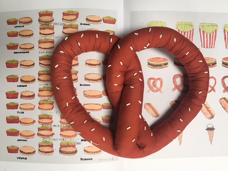 今回のイベントは本に収められた作品の原画、そしてこのために描きおろした新しい作品を展示販売。それからとても貴重なケンヤさんのスケッチブックも展示。そして"Yuki & Daughters"からは、ケンヤさんの作品の中から飛び出した、アイコニックなアメリカンフードの布のオブジェを展示販売されるそうです。