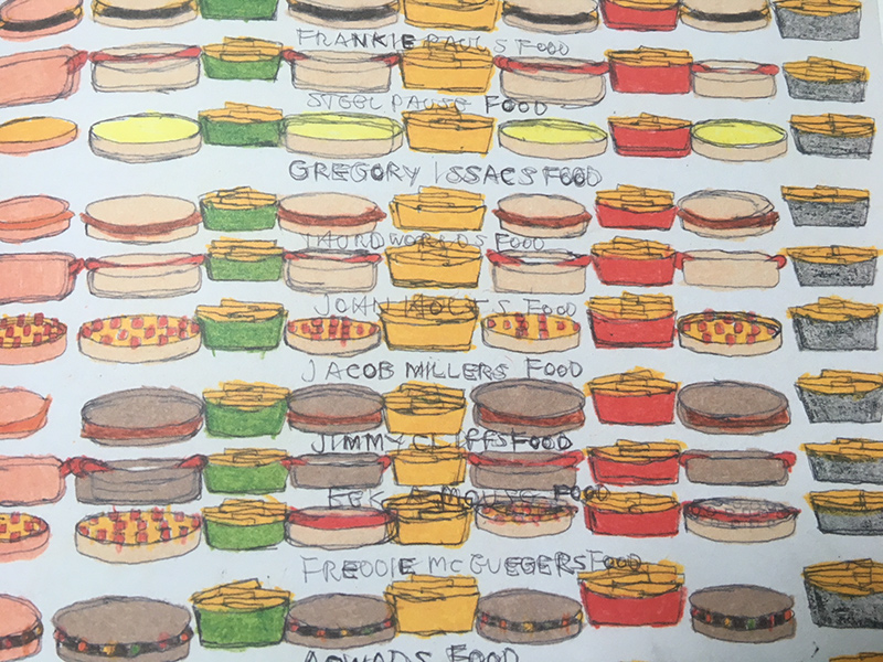ケンヤさんはブルックリン生まれのブルックリン育ち。小さい頃はレゲエやR&Bが流れるキッチンでおばあちゃんやお母さんがお料理する姿をみて育ちました。絵を描きはじめたのはケンヤさんが7歳くらいの頃。レコードカバーやコーンフレークの箱の絵からはじまりました。またその頃、いろんな物も集めだしました。その中の一つが茶色の紙袋で、ケンヤさんのベッドの下にはたくさんの絵や茶色の紙袋がきちんと整頓して収納されていたそうです。