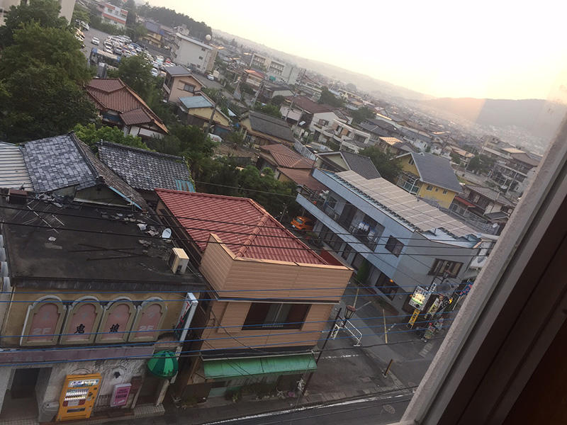 4畳ほどのビジネスホテルの部屋から見える景色に、